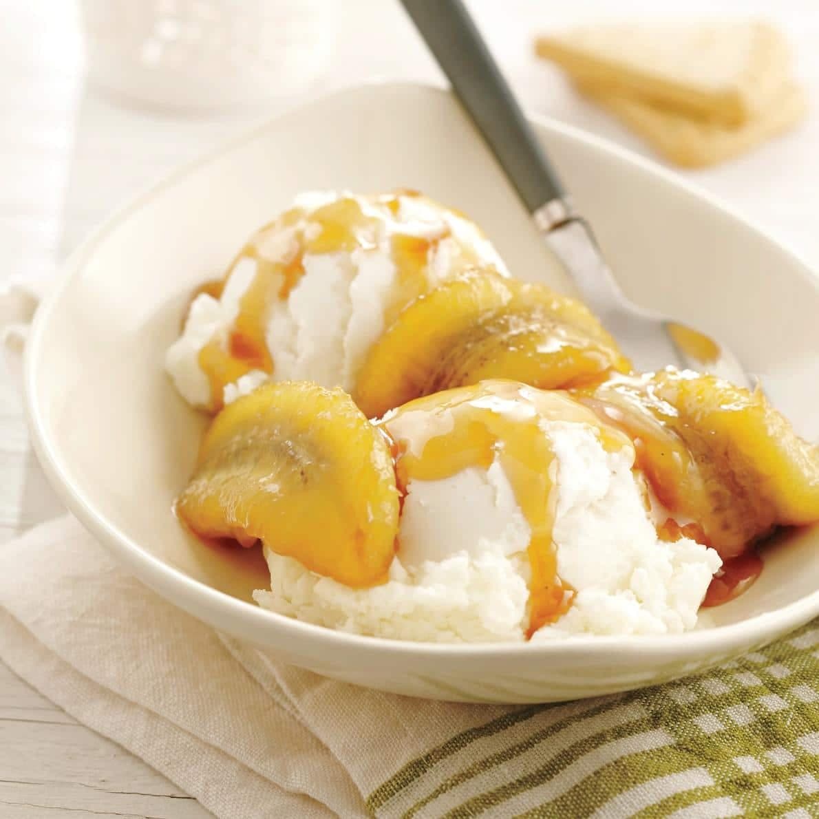 - Ajouter les bananes et réchauffer de 1 à 2 minutes en inclinant le poêlon pour bien les enrober.