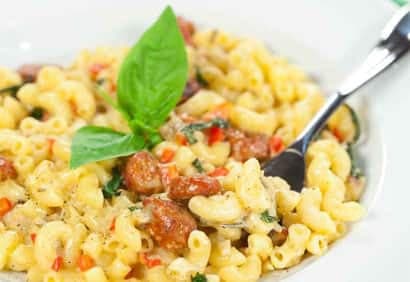 - Entre-temps, dans un poêlon, faire fondre le beurre à feu moyen-vif. Ajouter l'échalote, les pleurotes et l'ail et les faire revenir pendant 2 minutes. Ajouter le poivron et cuire jusqu'à ce qu'il commence à ramollir. Réduire à feu moyen et incorporer la crème. Ajouter le cheddar et le parmesan et poursuivre la cuisson jusqu'à ce qu'ils aient fondu. Dans un autre poêlon, cuire les saucisses, puis les ajouter à la sauce.