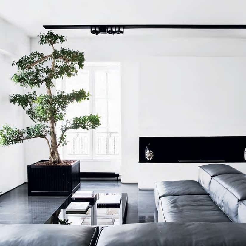 Installer un arbre dans la maison, comme ici un ficus ginseng, est-ce une bonne idée? Oui, mais à condition d’avoir un plafond assez haut pour permettre au végétal de croître minimalement et un plancher solide pouvant soutenir le poids du pot. On veille à faire pivoter celui-ci régulièrement afin que l’arbre reçoive de la lumière de tous les côtés.