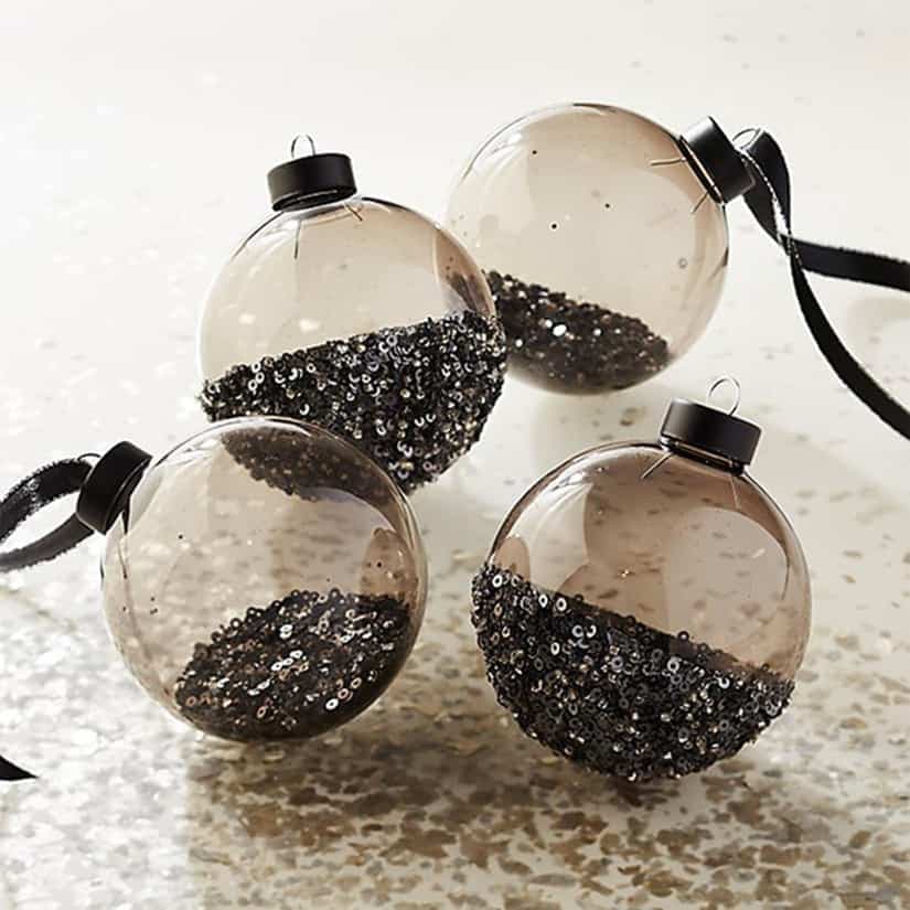 Pour donner du chic à votre sapin, ces boules de Noël en verre fumé et paillettes sont idéales. L’ensemble comprend deux boules avec paillettes à l’intérieur alors que les deux autres en sont partiellement recouvertes.