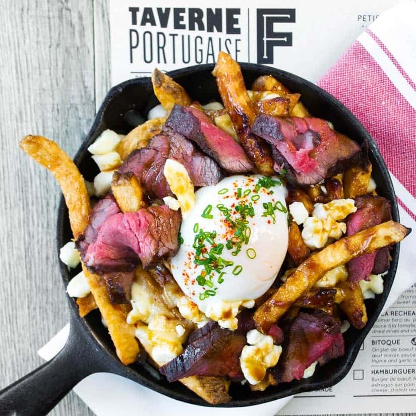 Frites, fromage à poutine Victoria fumé au Jameson, aiguillettes de porc laquées à l’érable et au soya, sauce veuve noire sucrée et oreilles de crisse marinées.