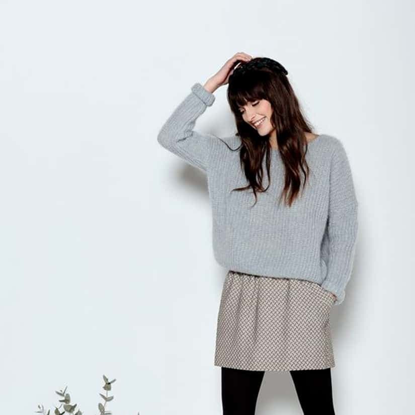La jupe en tweed et le pull en laine créent un mélange de textures superbe, parfait pour une tenue complétée par des bottillons.