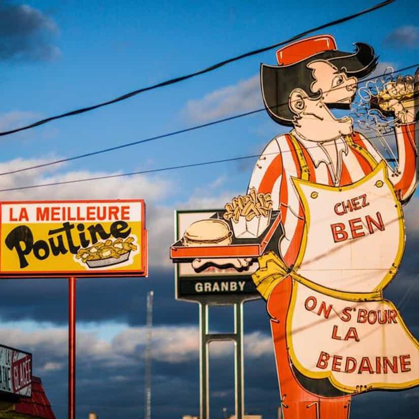 Tout a commencé en 1950 grâce à Bernard «Ben» Dubé qui, à 19 ans, a ouvert sa roulotte à patates. Plus de 70 ans plus tard, sur la 112, l’immense enseigne aux néons à l’effigie d’un bonhomme dégustant un hot-dog continue d’attirer les foules. Chez Ben, comme à l’époque, les patates sont épluchées à la main et les employés portent l’uniforme ligné blanc et rouge pour servir frites, rondelles, poutines, hamburgers et pogos.