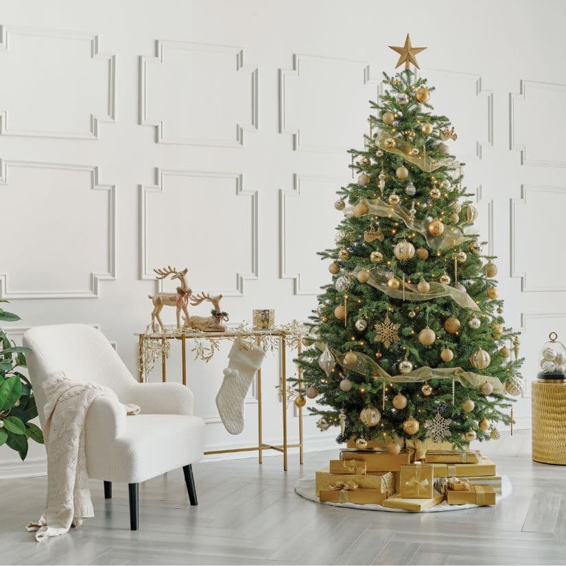Imaginez un élégant sapin orné de flocons blancs et dorés, de rennes au fini laiton et de boules fantaisistes aux accents métalliques, le tout dans un décor digne de contes de fées rempli de velours, de lainage et d’étoffes matelassées.