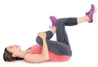 A. Couchée sur le dos, on dépose la cheville droite sur le genou gauche. B. Avec la main, on amène le genou droit vers l’épaule gauche en maintenant la cheville en place. L’étirement doit se faire sentir au centre de la fesse. Une fois l’exercice maîtrisé, on l’effectue assise sur une chaise ou debout contre un mur. Dans les deux cas, on prend soin de maintenir le creux naturel au bas du dos. Maintenir 30 secondes en respirant et répéter 3 fois de chaque côté.