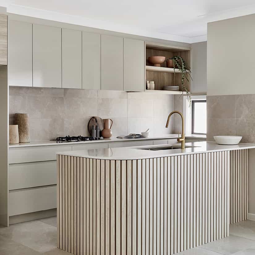 Le bois clair de l’îlot, la peinture beige des caissons et la teinte du marbre se complètent pour créer un effet zen.