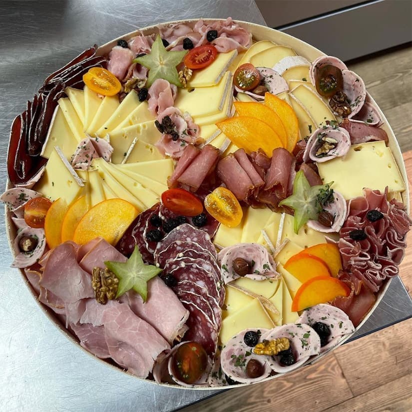 Légumes coupés, charcuteries, fromages, olive, cornichons, pain frais... Tout est possible. Vous pouvez même y inclure des sauces dans différents pots ou encore ajouter des étages à votre planche pour séparer les aliments.