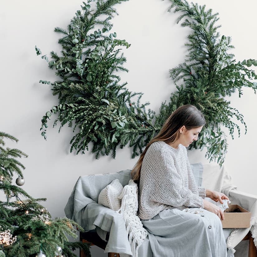 Tiges d’eucalyptus, pommes de pin, couronnes de feuillage et branches trouvées dans la forêt sont des éléments parfaits pour camper un décor totalement nature. Pour une ambiance de ce type, on marie les végétaux avec de petites lumières blanches toutes simples, des bougies et des matières authentiques comme le bois et le lin.