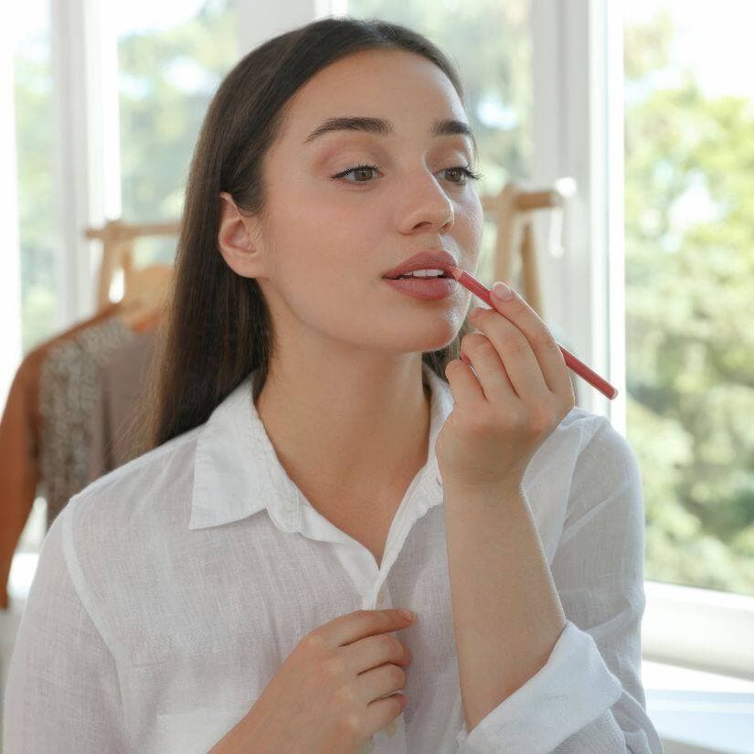 Traditionnellement, on applique le crayon avant le rouge à lèvres pour délimiter et préparer la zone. Mais il peut aussi être appliqué après pour corriger ou intensifier la couleur.