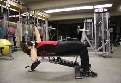 La main et le genou droits sur un banc, le pied gauche au sol, le bras gauche fléchi avec le coude collé au tronc et un poids dans la main (la paume vers le tronc), allonger le bras vers le bas de façon à ce qu'il soit perpendiculaire au sol. Faire 25 répétitions, puis inverser la position pour faire travailler le côté droit.