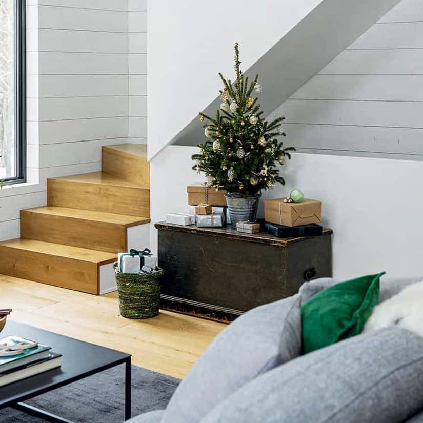 Dans cette petite pièce, la tradition est encore au rendez-vous grâce aux lambris et aux carreaux métro classiques, mais le meuble en métal, les appliques rondes et la tuyauterie apparente donnent au décor un certain style industriel. Ici aussi, un sapin (seule touche de couleur dans cet environnement neutre) rappelle que l’heure est à la fête.