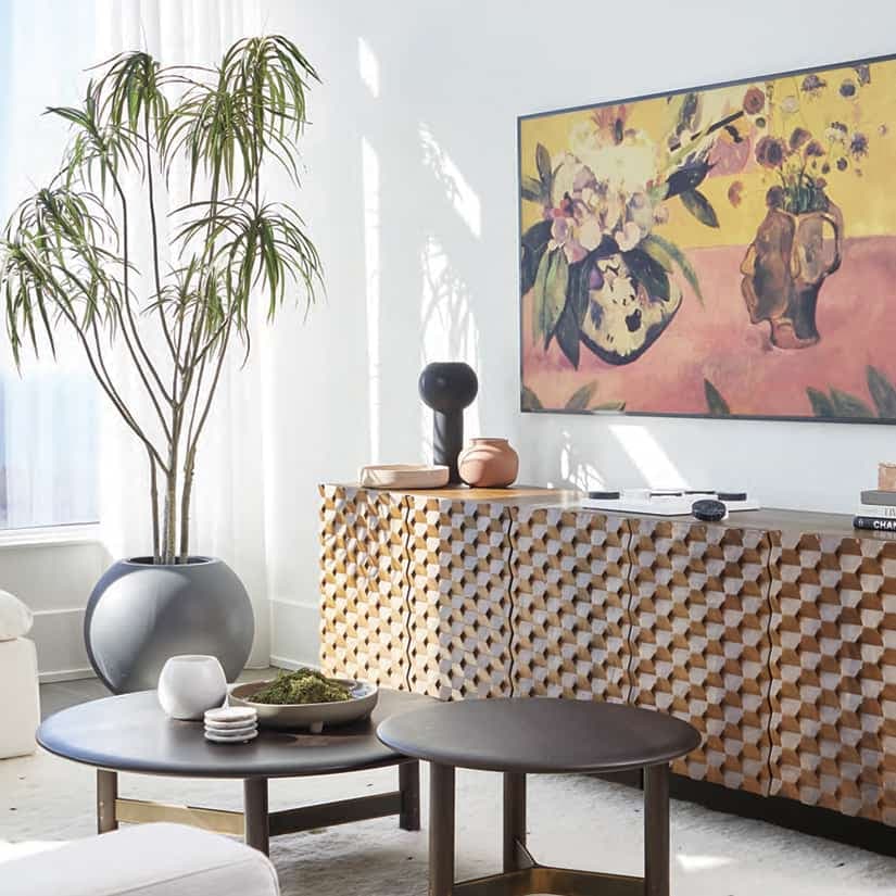 Aménagement Bradley Marks et Jeff Wortley, designers, Marley Studio • Console noire (devant la fenêtre) et arbre artificiel en pot crateandbarrel.ca • Canapé Sundays • Fauteuil et table d’appoint Klaus • Tables basses Nuevo • Applique Spyder (sur le mur fenêtré) Elte • Coussins Tonic Living • Jeté crateandbarrel.ca • Tapis cb2.ca