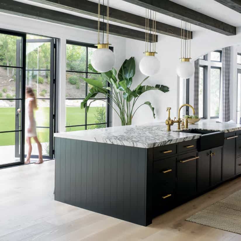En franchissant l’élégante arche depuis le salon, on pénètre dans une cuisine sur mesure au charme incontestable. Véritable pièce maîtresse de la maison, cet espace éblouit par son marbre violet somptueux, son robinet Waterworks à finition vivante et ses électroménagers haut de gamme signés Sub-Zero et Wolf. Des luminaires sculpturaux et une hotte intégrée viennent parfaire l’ensemble, conjuguant esthétique et fonctionnalité avec brio.