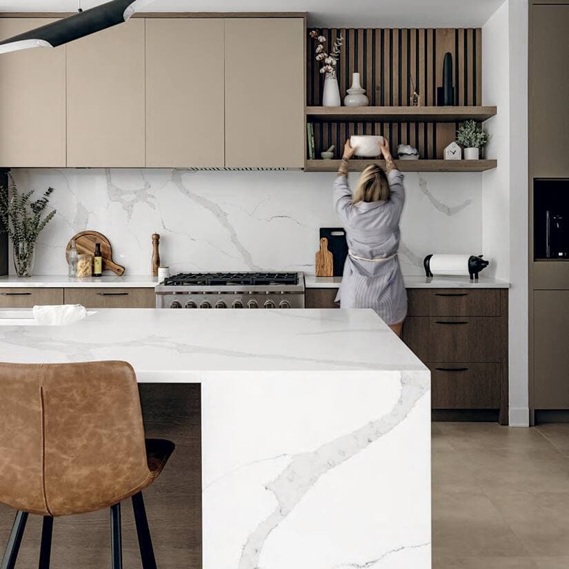Carrelage au sol Glitch (Sand) Centura • Dosseret cellier et garde-manger (Corina) Centura • Comptoir en quartz (Chilliwack) Nouveau Décor • Lattes Créations Contemporaines