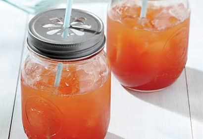 2. Filtrer la préparation dans des verres ou des pots remplis de glaçons. Garnir de demi-fraises et d'un brin de menthe, si désiré.
