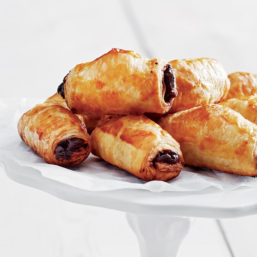 - Sur une surface de travail, dérouler la feuille de pâte et la couper en trois sur la longueur, puis en cinq sur la largeur, de manière à obtenir 15 carrés de pâte. Répartir le chocolat au centre des carrés de pâte.