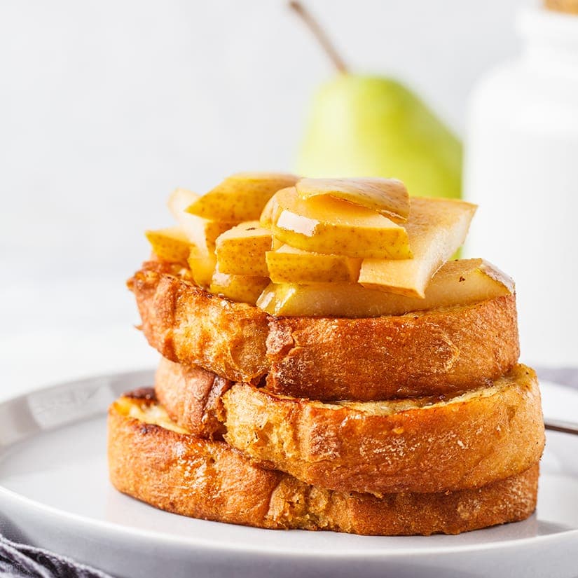 - Au moment de servir, mettre deux tranches de pain doré dans chaque assiette. Garnir des poires pochées et d'une cuillerée de yogourt. Arroser du sirop réduit.