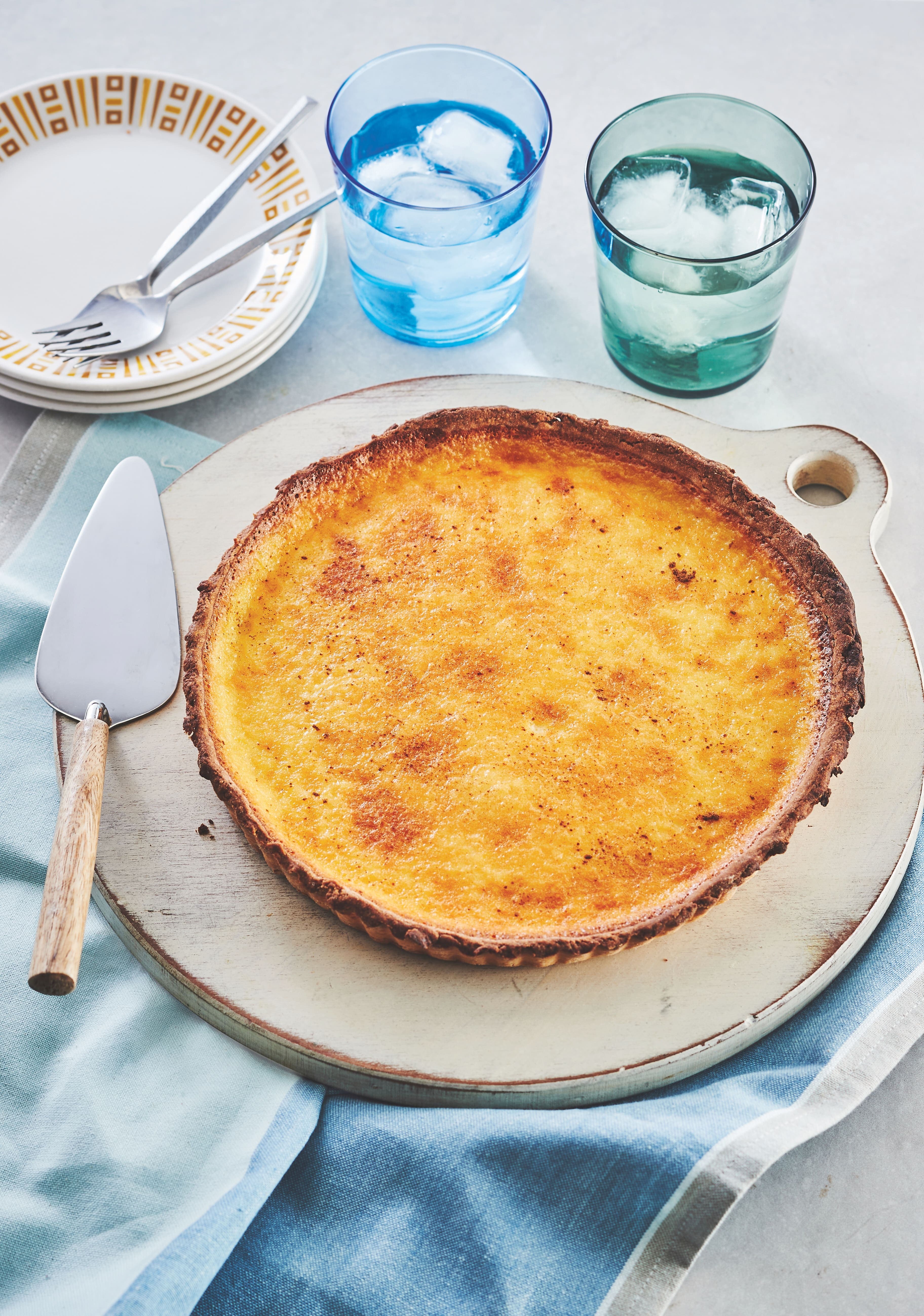 - Dans un bol, à l'aide du mélangeur électrique, fouet- ter les œufs et le sucre à vitesse moyenne 2 minutes ou jusqu'à ce que la préparation soit pâle et légère. Ajouter la crème, le lait et la vanille. Fouetter jusqu'à ce que le tout soit homogène. Verser dans la croûte refroidie et saupoudrer d'un peu de muscade et/ou de cannelle. Cuire sur la grille du bas du four 45 minutes ou jusqu'à ce que le centre soit presque pris. Laisser refroidir complètement, au moins 1 heure, avant de couper en parts.