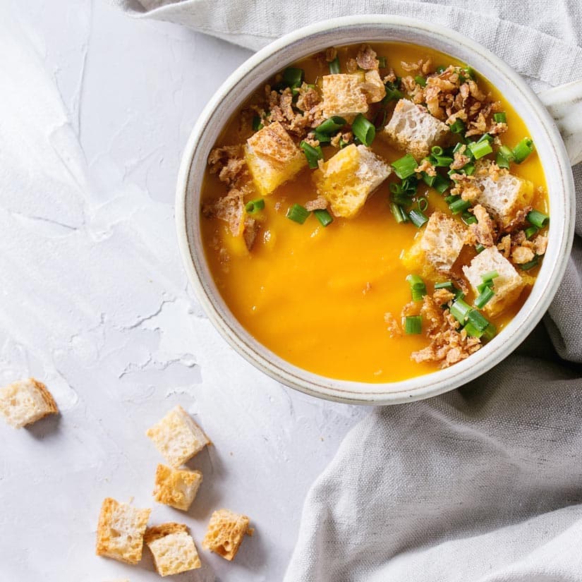 Sur une plaque de cuisson tapissée de papier parchemin, mélanger 2 t (500 ml) de cubes de pain pumpernickel, 1 c. à tab (15 ml) d'huile d'olive, 1 gousse d'ail hachée et une pincée chacun de sel et de poivre. Cuire au four à 400 °F (200 °C) pendant 12 minutes ou jusqu'à ce que les cubes de pain soient croustillants.