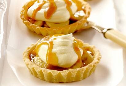 Tartelettes aux bananes et au caramel, crème au chocolat blanc