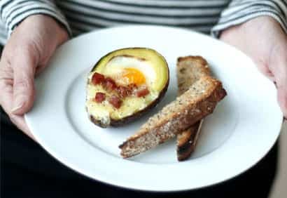 Cuire au four préchauffé à 425°F (220°C) pendant 15 minutes ou jusqu’à ce que le blanc des œufs soit légèrement ferme et le jaune, encore coulant. Astuce: on dépose les avocats sur un lit de gros sel, ce qui permet de les stabiliser sans altérer la couleur de la chair à la cuisson.