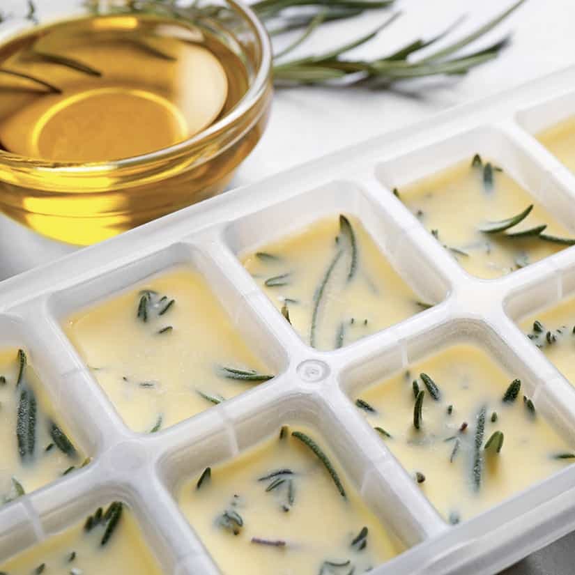 En effet, lorsque les fines herbes sont abondantes et qu’on en a en surplus, une bonne idée consiste à les hacher et à les congeler dans des moules à glaçons remplis d’huile d’olive.