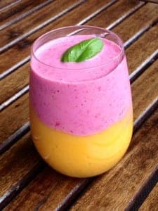 Broyez d’abord la mangue, la banane et le jus d’orange au mélangeur, puis versez ce premier mélange dans deux verres de forme allongée. Rincez le contenant du mélangeur et mettez-y les framboises, le yogourt, le lait de soya et une feuille de basilic. Broyez le tout jusqu’à l’obtention d’une texture lisse et, à l’aide d’une cuillère, ajoutez délicatement ce mélange par-dessus la première partie. Ajoutez une feuille de basilic dans chaque verre, en guise de décoration.