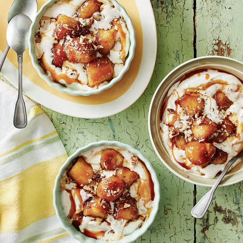 - Déposer de la crème fouettée dans chaque assiette, en formant un puits avec le dos d'une cuillère. Verser du caramel au beurre salé au centre et répartir les morceaux de banane. Parsemer de pacanes concassées. Servir aussitôt.