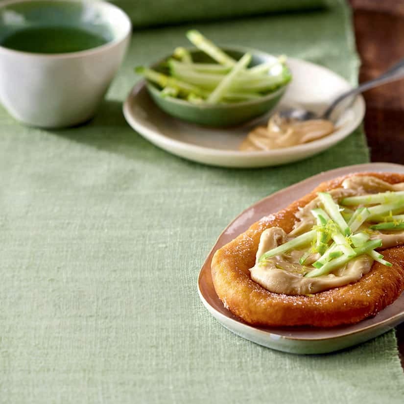 - Au moment de servir, couper la pomme en julienne. Dans un petit bol, mélanger la pomme, le zeste et le jus de citron. Étendre le beurre d'érable sur les beignes encore chauds, puis les garnir de la préparation à la pomme. Servir aussitôt.