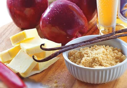 - Dans une casserole, combiner les moitiés de gousse, les morceaux de pommes, la cassonade et le cidre de glace.