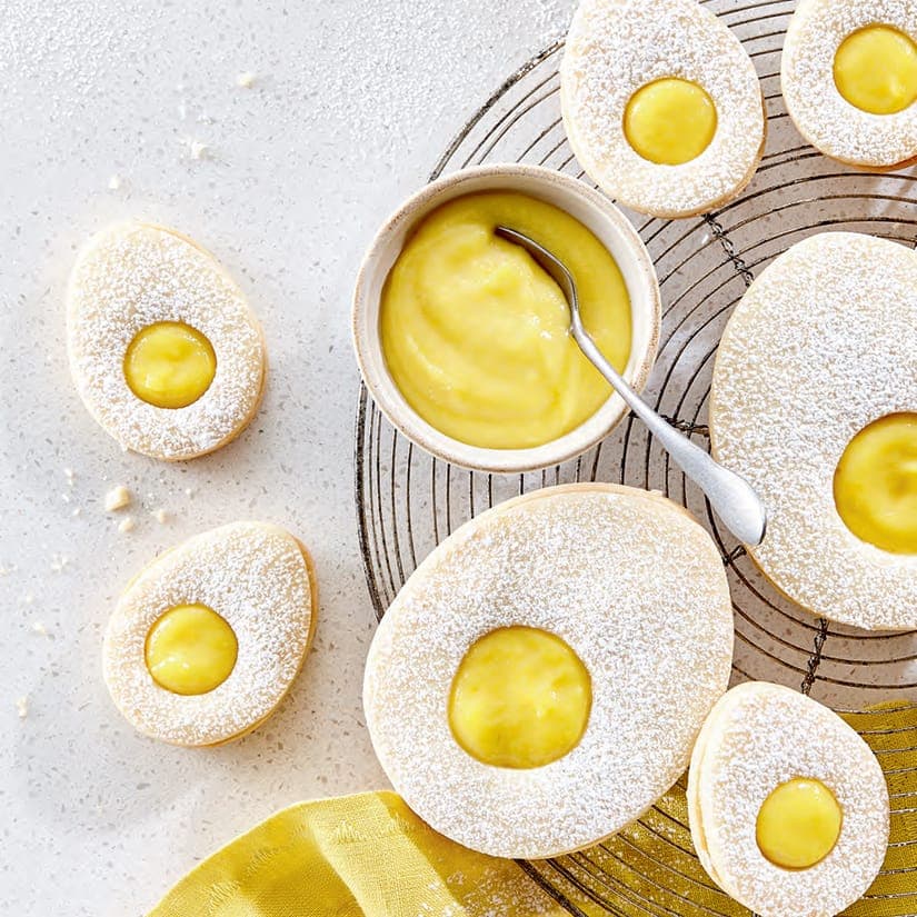 - Retourner les biscuits non troués et étendre de la crème de mangue sur chacun d'eux. Parsemer les biscuits troués de sucre glace, si désiré, puis les disposer sur les biscuits garnis de crème, en pressant légèrement pour les faire adhérer. (Les biscuits se conserveront jusqu'au lendemain à la température ambiante.)