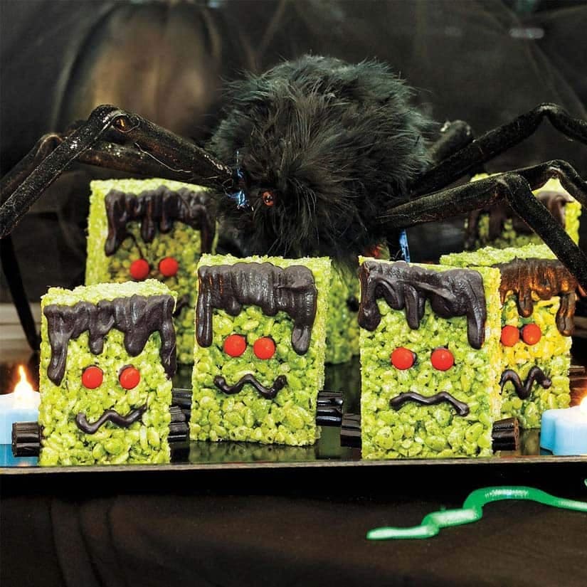 - Mettre un peu du reste du chocolat fondu au dos de chaque pastille rouge et les fixer sur le visage pour former les yeux. Mettre un peu du reste du chocolat fondu à une extrémité d'un morceau de réglisse et le fixer sur l'un des côtés du visage pour former un boulon. Laisser reposer pendant 5 minutes ou jusqu'à ce qu'il tienne bien. Répéter avec le reste des morceaux de réglisse.