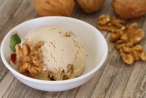- À l'aide d'une cuillère, étendre environ le quart de la crème glacée dans un contenant hermétique. Parsemer du tiers des noix de Grenoble réservées et former une spirale légère dans la crème glacée avec la cuillère. Faire deux autres étages de la même manière. Couvrir du reste de la crème glacée. Congeler pendant environ 6 heures ou jusqu'à ce que la crème glacée soit ferme.