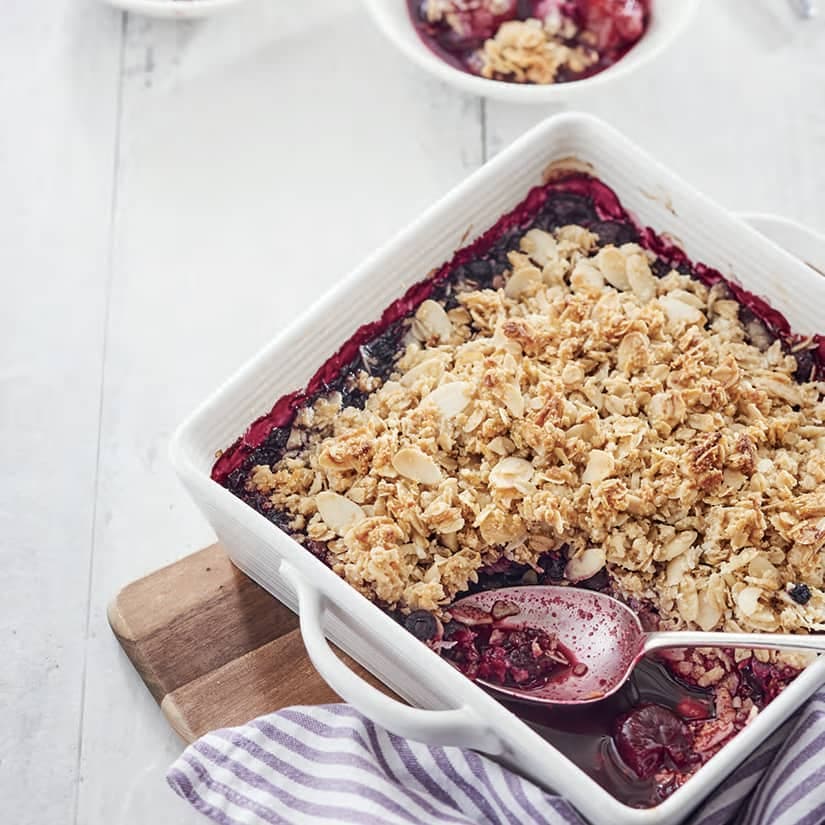 - 2. Dans un autre bol, mélanger tous les ingrédients du crumble jusqu'à l'obtention d'une texture homogène. Répartir sur le mélange de fruits.