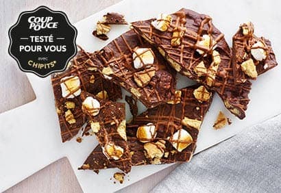 - Dans un bol en métal placé sur une casserole d'eau chaude mais non bouillante, faire fondre le chocolat mi-sucré en remuant. Retirer du feu. Ajouter ¾ t des gaufrettes et mélanger. Ajouter ¾ t des guimauves et mélanger en les séparant avec les doigts au besoin (elles seront collantes).