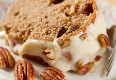 - Dans le grand bol du malaxeur, battez le beurre jusqu'à ce qu'il soit léger et crémeux. Incorporez le sucre, 1/3 tasse (75 ml) à la fois, et battez à grande vitesse pendant environ 3 minutes, jusqu'à ce que le mélange soit léger et mousseux. En battant, incorporez les oeufs, un à la fois, puis le rhum et la vanille (le mélange ne sera peut-être pas homogène). Incorporez les ingrédients secs un tiers à la fois et en alternant avec le babeurre. Ajoutez les pacanes. Versez le mélange dans les deux moules et lissez la surface.