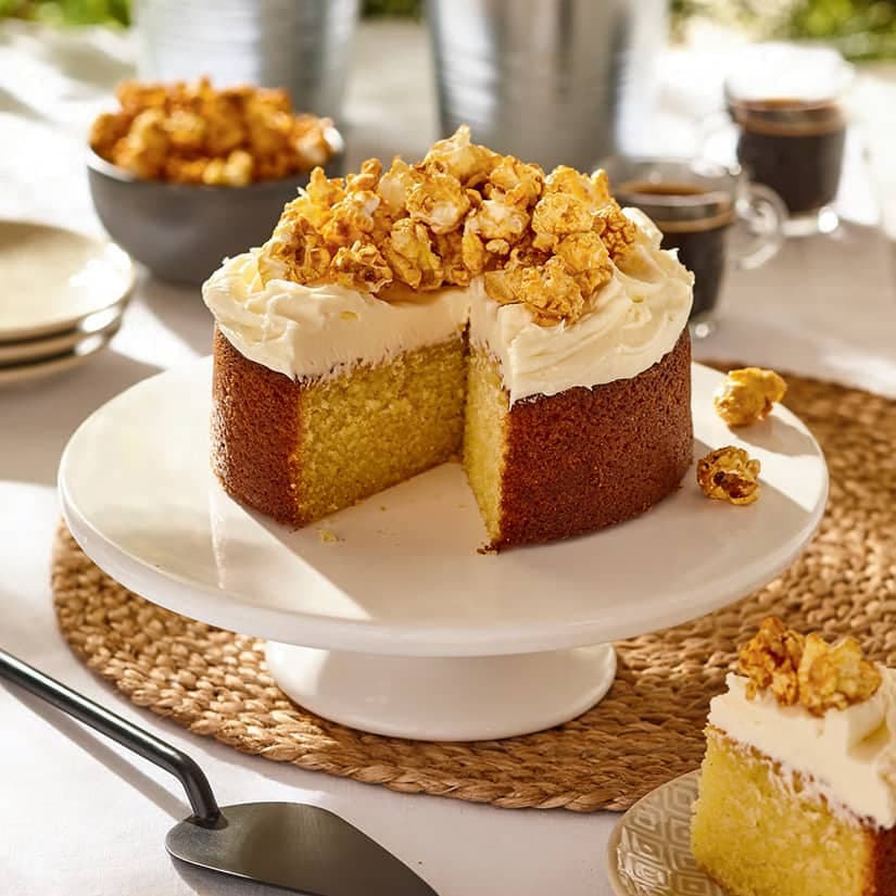 4. À l’aide d’une spatule, couvrir le dessus du gâteau refroidi de la crème au beurre et garnir du maïs soufflé.