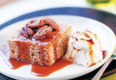 - Au moment de servir, couper le gâteau en douze portions. Verser 1 c. à tab (15 ml) de la sauce à l'érable dans chaque assiette. Mettre le gâteau sur la sauce et garnir de crème glacée. Arroser de sauce et parsemer des pacanes pralinées.