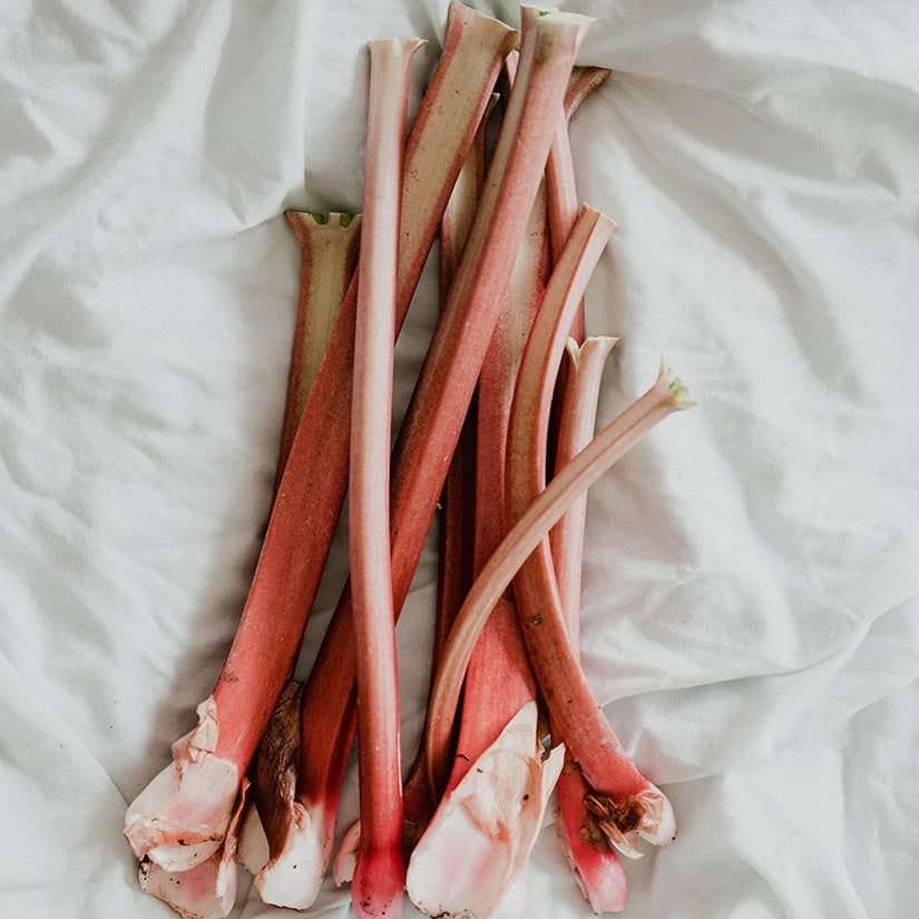 - Mettez le beurre dans un moule à gâteau en métal carré de 9 po. de côté (2,5 L) et faites-le fondre au four préchauffé à 375°F (190°C). Badigeonnez les parois du moule d'un peu de beurre fondu. Disposez la rhubarbe au fond du moule, côté plat vers le bas, en quatre rangées uniformes; saupoudrez du sucre et de la cannelle. Couvrez de papier d'aluminium et faites cuire au four pendant 10 minutes; retirez le papier d'aluminium.