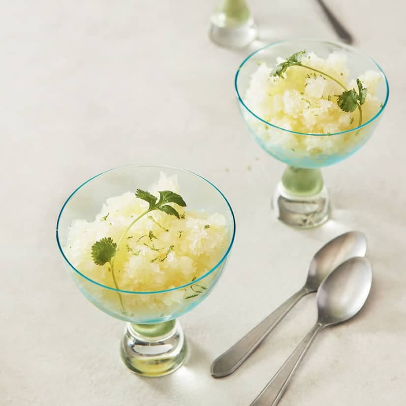 - Répartir le granité dans des coupes à dessert et garnir de feuilles de coriandre fraîche et de zeste de lime, si désiré.