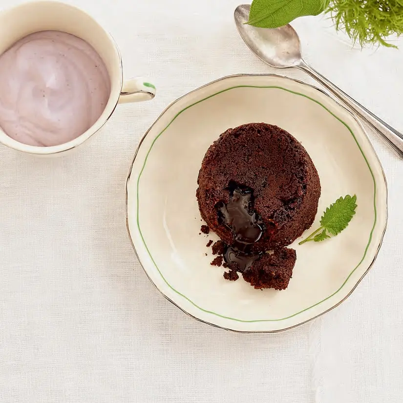 - Mettre les ramequins sur une plaque de cuisson et cuire au four préchauffé à 400 °F (200 °C) pendant 10 minutes ou jusqu'à ce que les moelleux commencent à prendre sur le pourtour, mais que leur centre soit encore mou. Retirer les ramequins du four et laisser refroidir 5 minutes. Passer la lame d'un couteau le long de la paroi interne des ramequins et démouler délicatement les moelleux dans des assiettes. Garnir de la crème fouettée réservée et de feuilles de mélisse, si désiré.