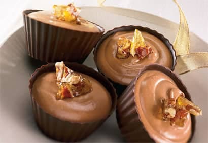 - Remplir chaque coupe en chocolat d'environ 1/4 t (60 ml) de la mousse au chocolat. Réfrigérer pendant environ 1 heure ou jusqu'à ce que la mousse soit ferme. (Vous pouvez préparer les coupes à l'avance et les couvrir. Elles se conserveront jusqu'au lendemain au réfrigérateur.) Au moment de servir, garnir les coupes de caramel croquant au noix (nut brittle), si désiré.