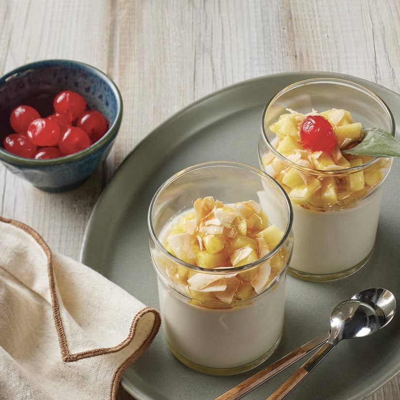 - Au moment de servir, garnir les panna cottas de l'ananas macéré, de la noix de coco râpée et des cerises, si désiré. Arroser d'un filet de miel, si désiré.
