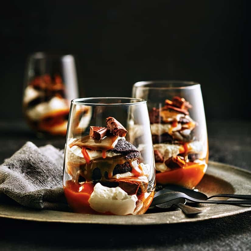- À l'aide d'un couteau dentelé, couper les petits gâteaux refroidis en trois horizontalement. Déposer une tranche de petit gâteau, le côté coupé vers le haut, au fond de 6 verres. Arroser chaque portion de 1 c. à thé comble (7 ml) de la sauce au caramel, puis couvrir de 1 c. à tab (15 ml) de crème fouettée. Faire deux autres étages de la même manière. (Les parfaits et le reste de la sauce au caramel se conserveront jusqu'au lendemain au réfrigérateur.) Servir arrosé du reste de la sauce au caramel et parsemé du chocolat haché.