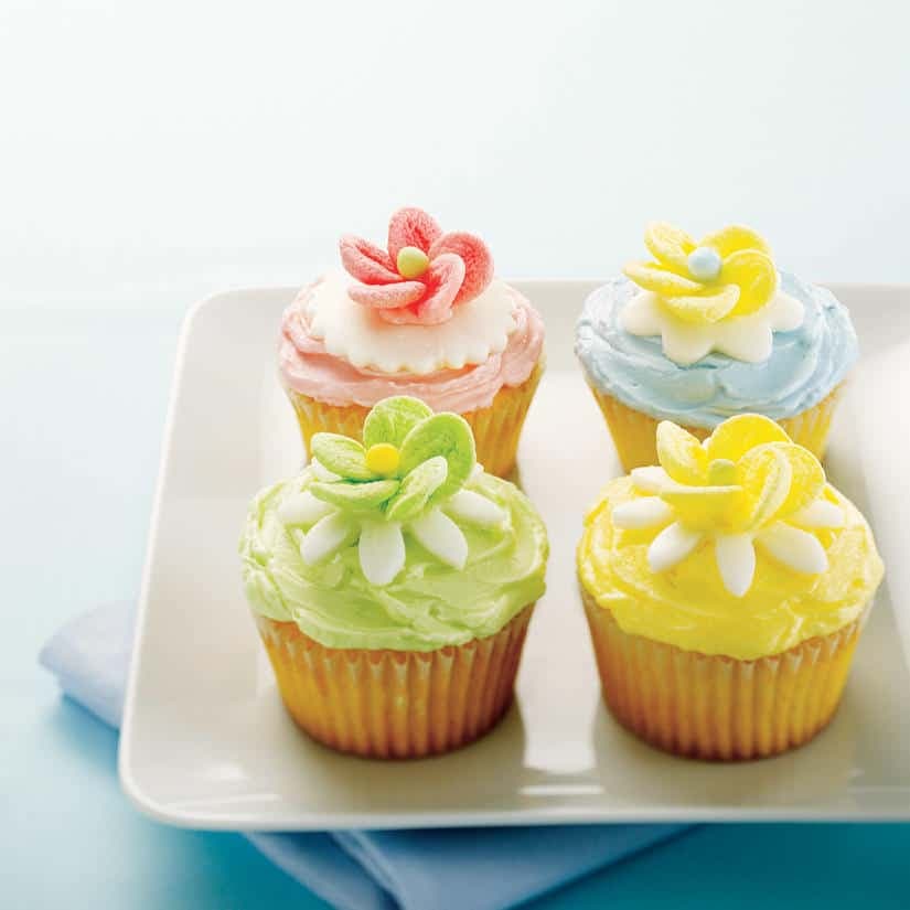 - Répartir le glaçage au beurre dans quatre bols. Incorporer une petite quantité de pâte colorante de la couleur désirée dans chaque bol de glaçage, en brassant jusqu'à ce que la teinte soit uniforme. À l'aide d'une spatule de métal, étendre le glaçage coloré sur les petits gâteaux refroidis (réserver une petite quantité de glaçage de chaque couleur pour coller les pétales en guimauves).