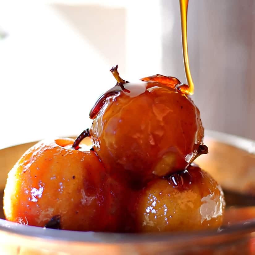 - Mettre les pommes dans le caramel, le côté coupé dessous, et les arroser de caramel. Cuire au four préchauffé à 400°F (200°C) pendant 40 minutes ou jusqu'à ce que les pommes soient tendres (badigeonner les pommes toutes les 10 minutes en cours de cuisson et les retourner 10 minutes avant la fin de la cuisson). Au moment de servir, disposer les pommes dans huit assiettes à dessert et les arroser du caramel.