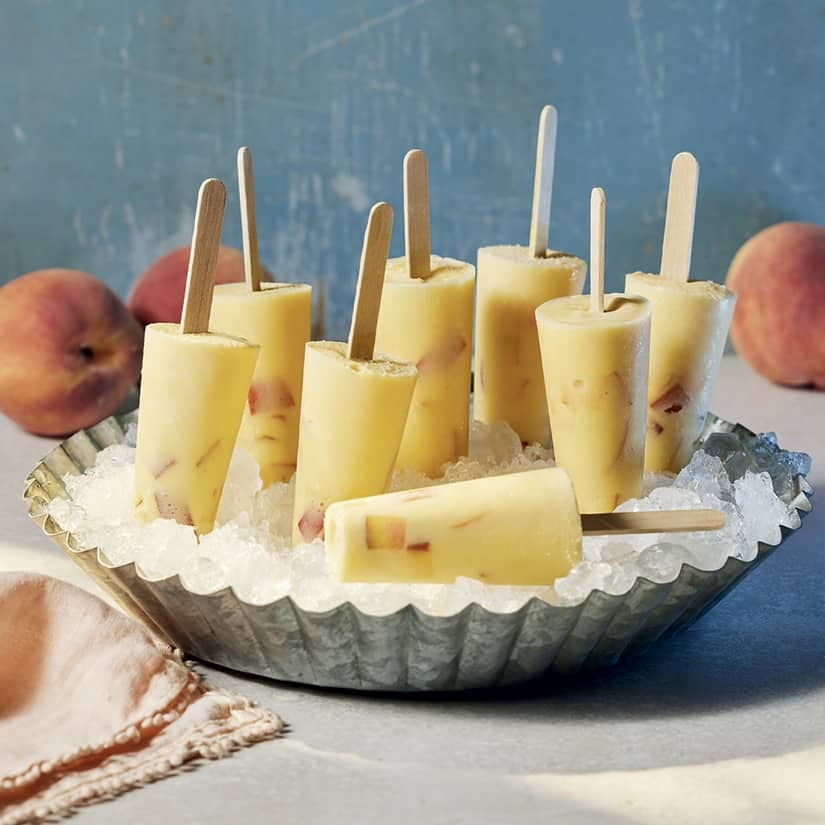 - Répartir le mélange dans des moules à popsicles. Congeler pendant environ 1 heure. Glisser les morceaux de pêche dans chaque moule à l'aide d'un couteau ou d'un bâtonnet de bois. Ajouter un bâtonnet dans chaque moule et congeler pendant au moins 5 heures.