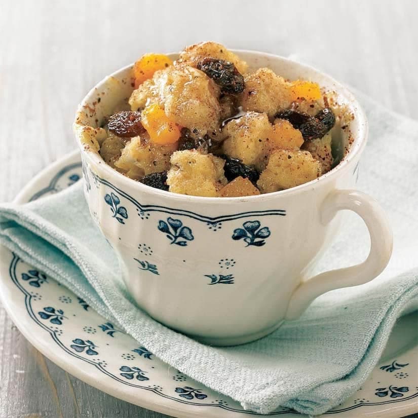 - Dans une grande tasse à café légèrement beurrée, déposer les cubes de pain en alternant avec les raisins secs (les tasser légèrement). Dans une tasse à mesurer, mélanger l'oeuf, le lait et le sucre. Verser le mélange liquide sur le pain et laisser reposer de 1 à 2 minutes. Parsemer de muscade et de cardamome.