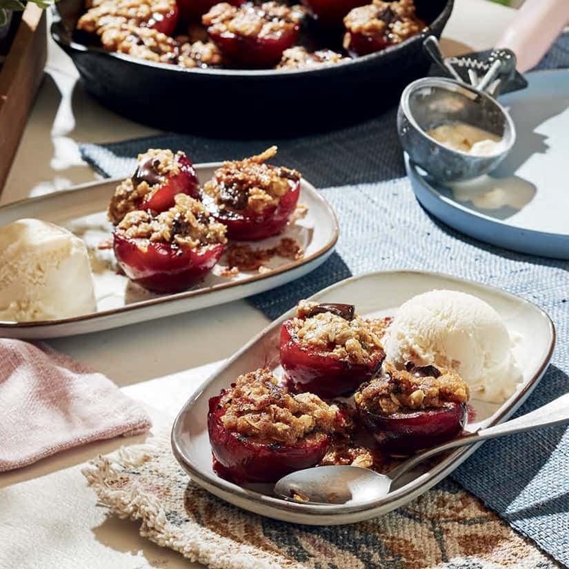 2. Dans un bol, mélanger le beurre, la cassonade, la chapelure graham et le chocolat haché pour former un crumble. Déposer les prunes dans un poêlon en fonte et les farcir avec le crumble au chocolat. Déposer la poêle sur la grille, côté éteint. Fermer le couvercle et laisser cuire de 10 à 12 minutes, jusqu'à ce qu'elles soient bien cuites et que le chocolat soit fondu. Servir les prunes grillées avec de la crème glacée à la vanille.