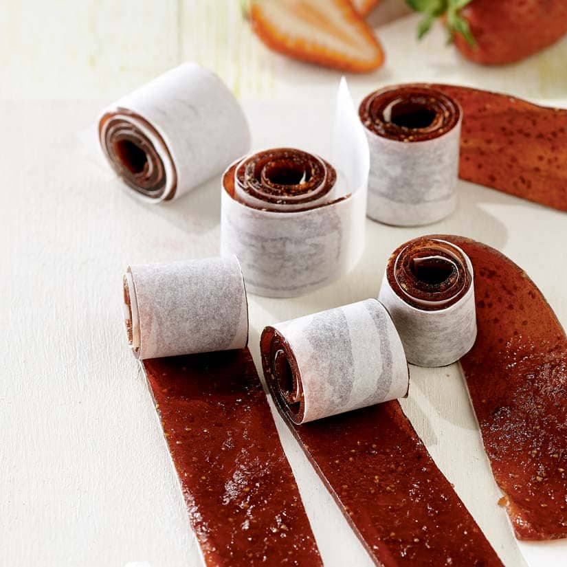 4. En commençant par un côté long, rouler la pâte de fruits avec le papier-parchemin. À l'aide de ciseaux, couper le rouleau en lanières de 1 po (2,5 cm) de largeur. (On peut préparer les roulés à l'avance et les mettre dans un contenant hermétique. Ils se conserveront jusqu'à 2 semaines à la température ambiante.)
